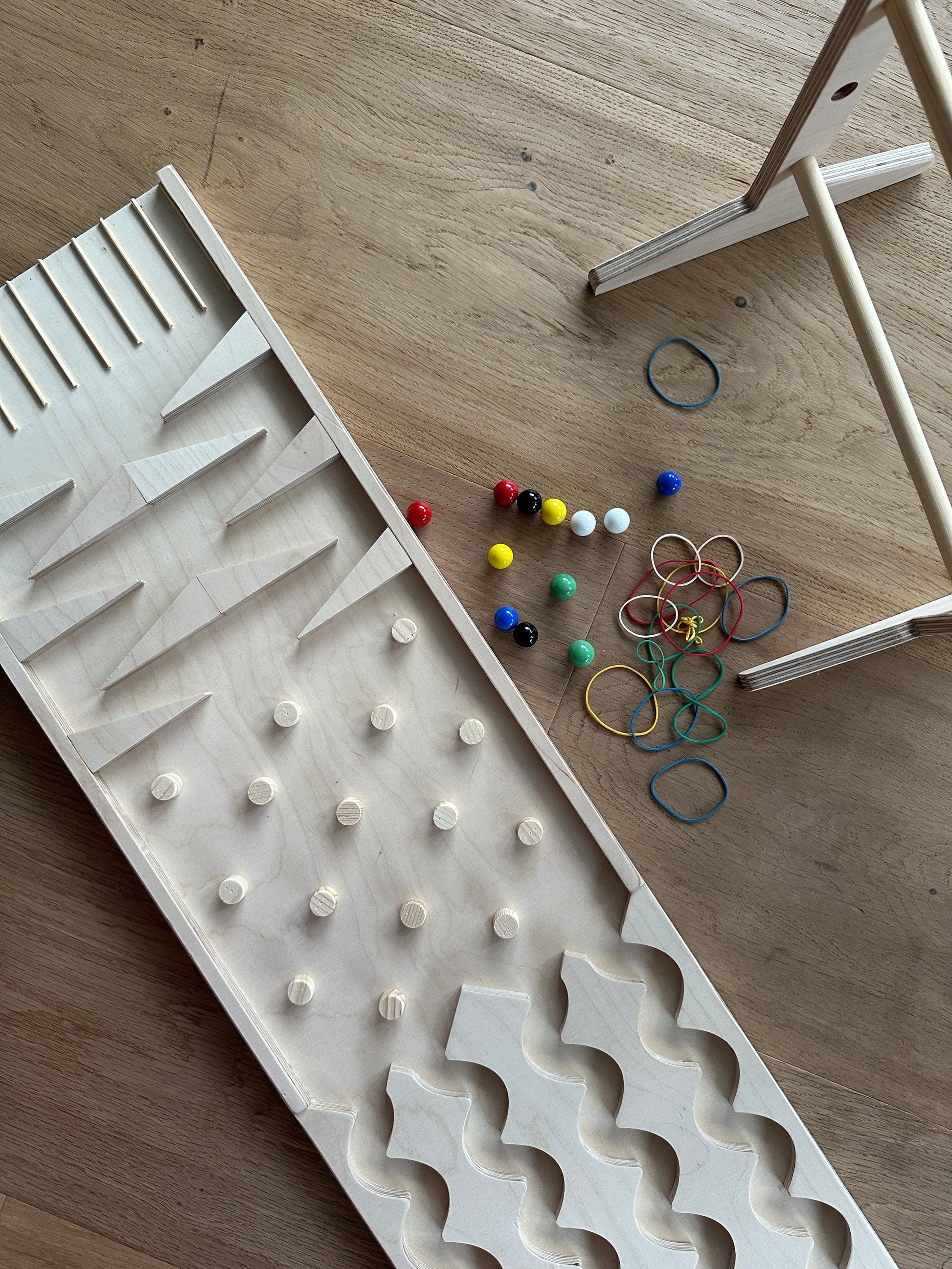 - Mit runden Elementen – die Kugeln können direkt darauf rollen oder mit Gummiringen kombiniert werden (für neue, kreative Strecken)