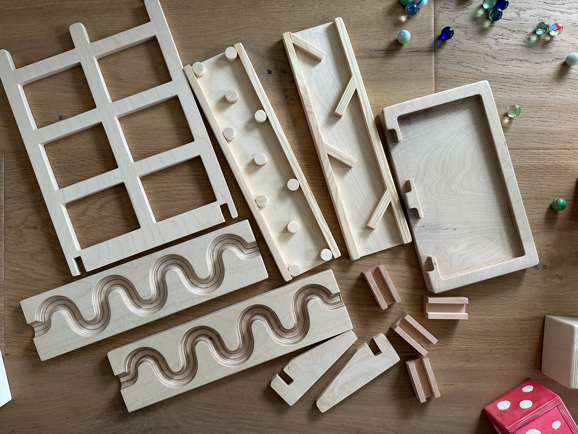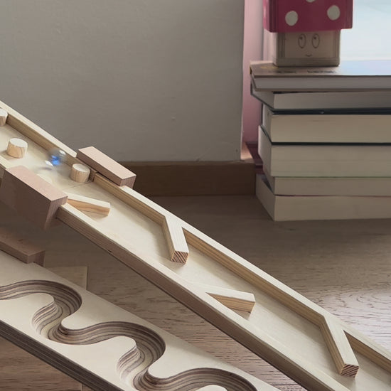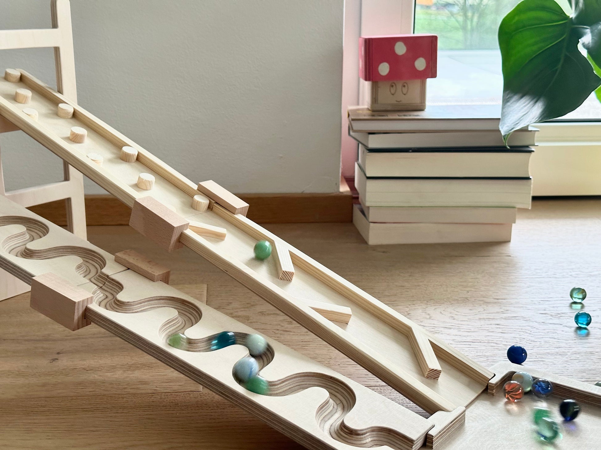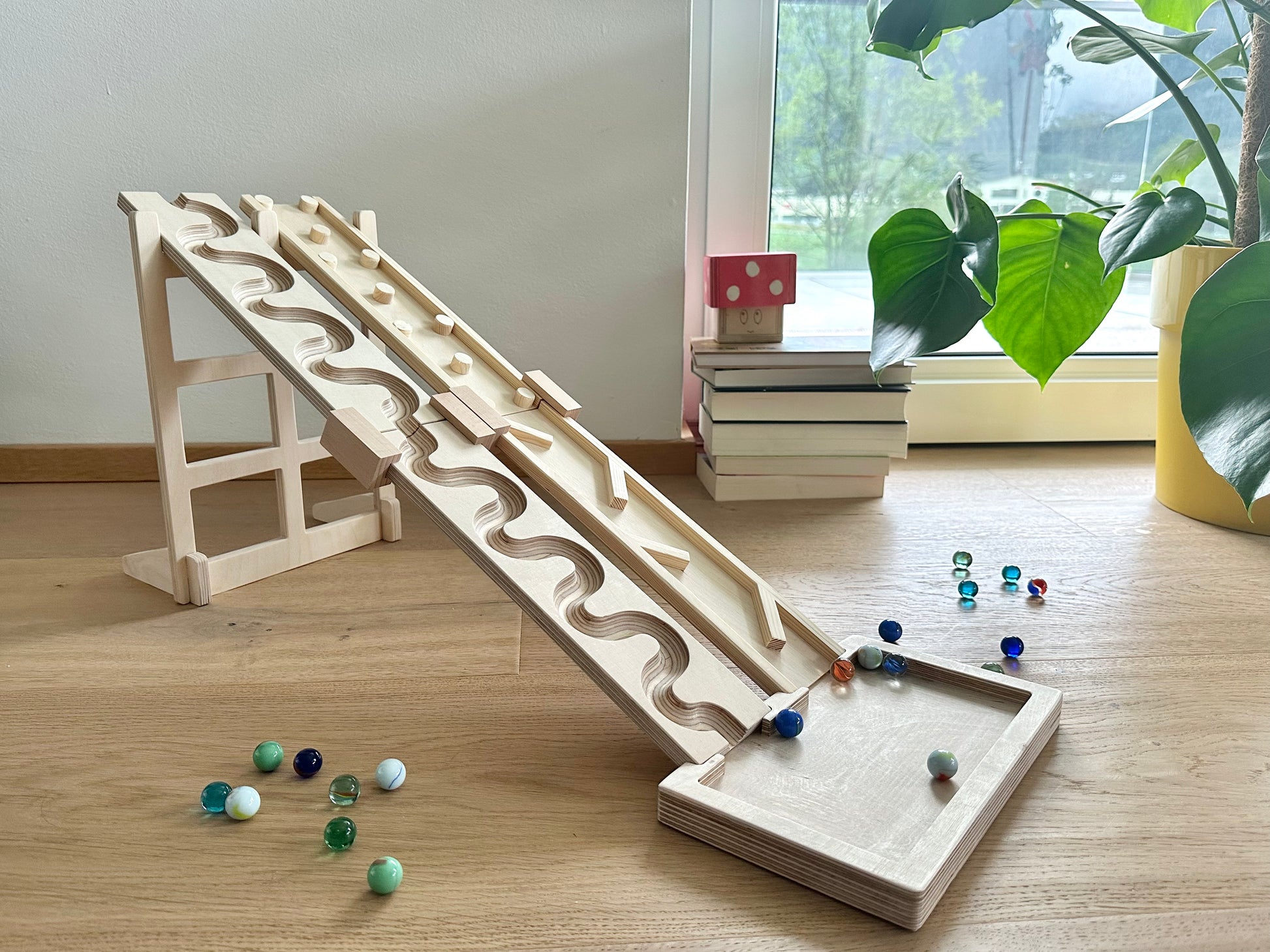 Unsere handgefertigten Murmelbahn-Set ist nicht nur ein Spaßfaktor, sondern auch eine stilvolle Ergänzung zu Ihrer Murmelbahn. Sie passen perfekt zum natürlichen Look unserer Bahnen und sind ein echter Hingucker in jedem Raum. Die Glasmurmeln sausen die verschiedenen Ebenen hinunter, bevor sie am Ende sicher in der Auffangschale landen. Ein fesselndes Spiel, das Kinder und Erwachsene gleichermaßen begeistert.