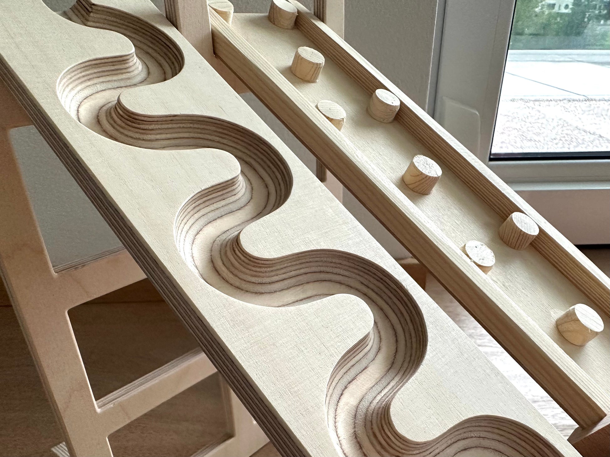 Tauchen Sie ein in die wunderbare Welt unserer handgefertigten Holz Murmelbahn! Diese zauberhaften Bahnen sind eine wahre Freude für Groß und Klein. Die sanften Klänge der rollenden Glasmurmeln versetzen Sie in eine beruhigende Stimmung, während sie elegant über die Holz-Platten gleiten.