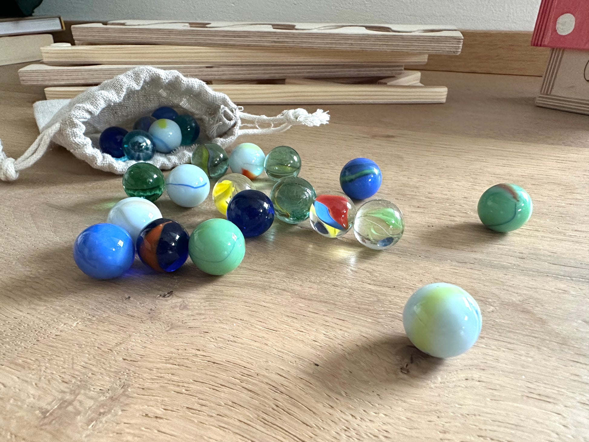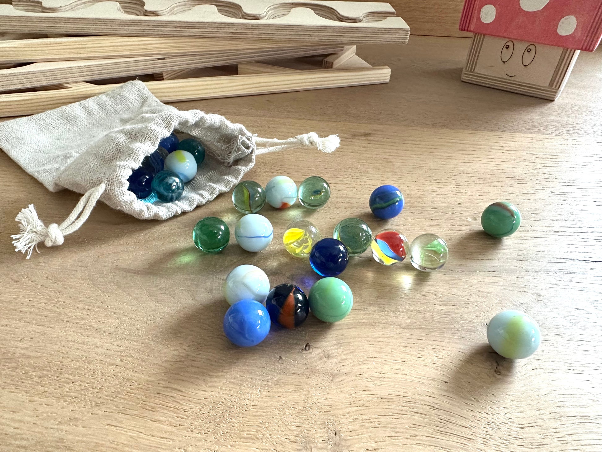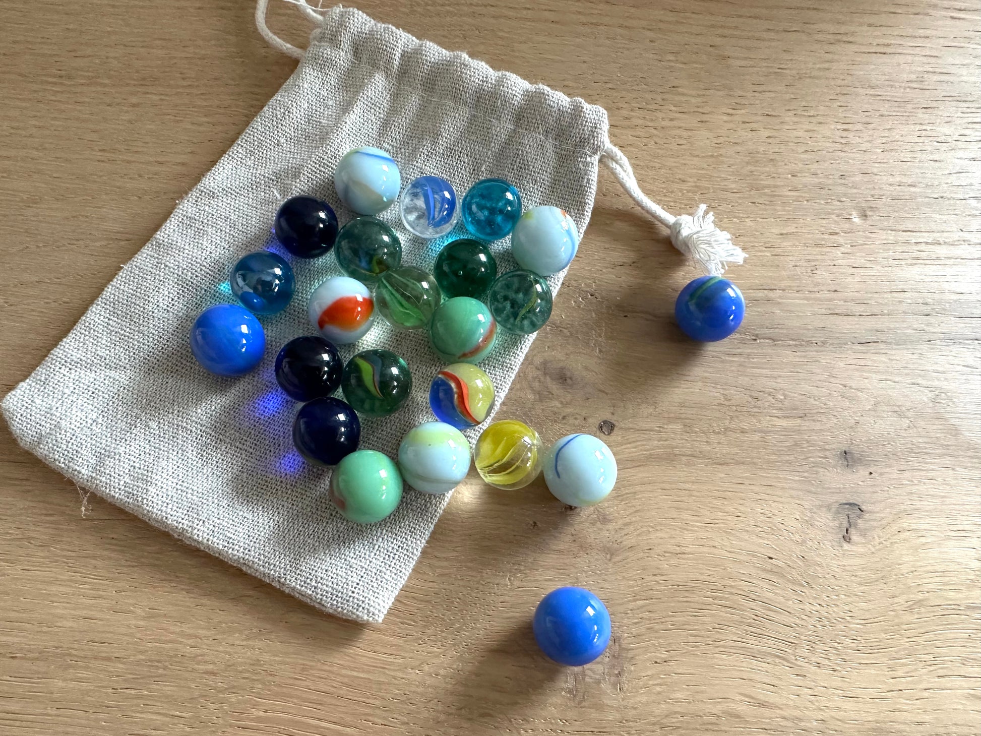 eine Extra Portion von Murmel. ein Baumwollsäckchen mir 25 Glas Murmel in verschiedene Größen und Farben.