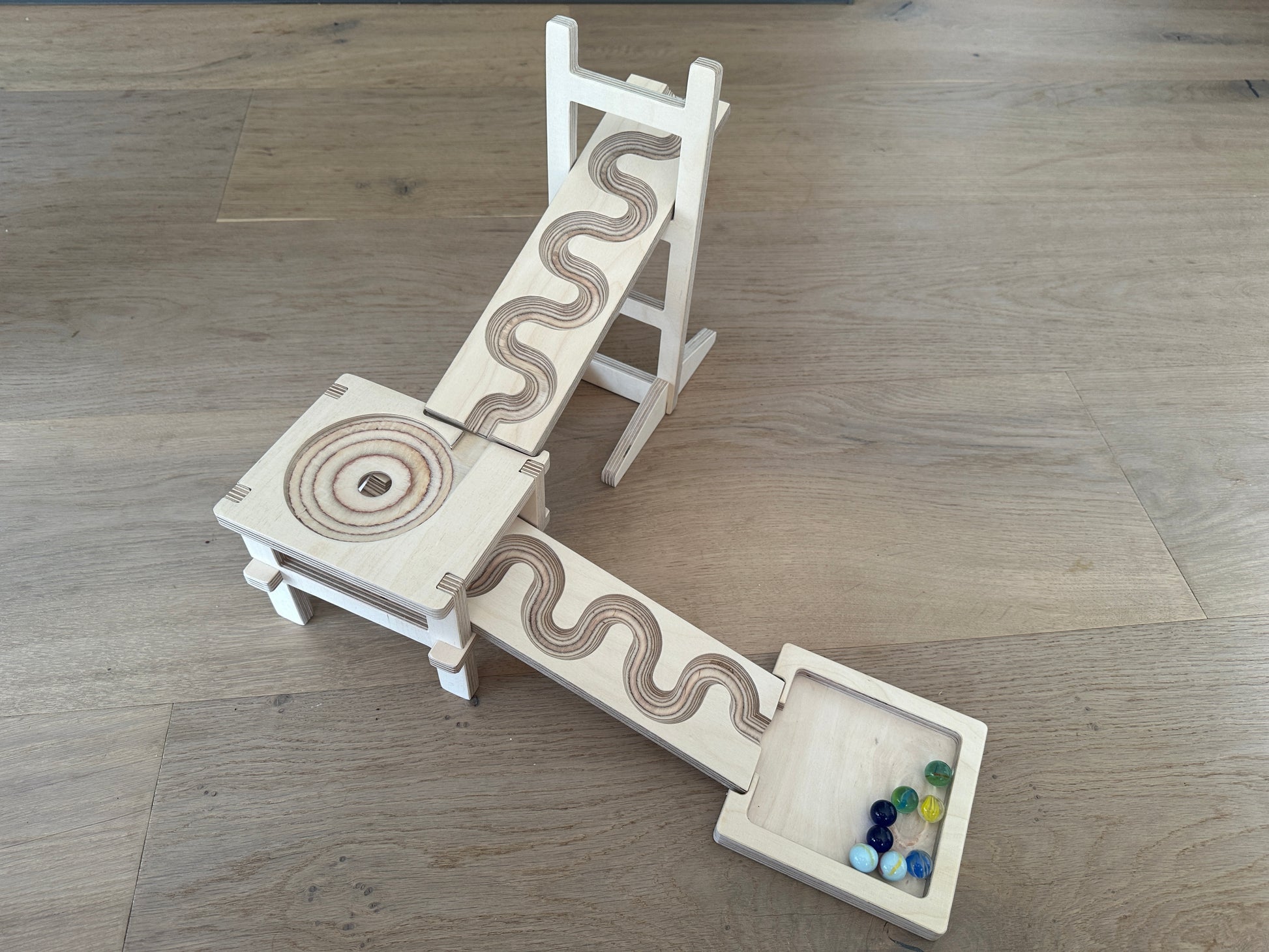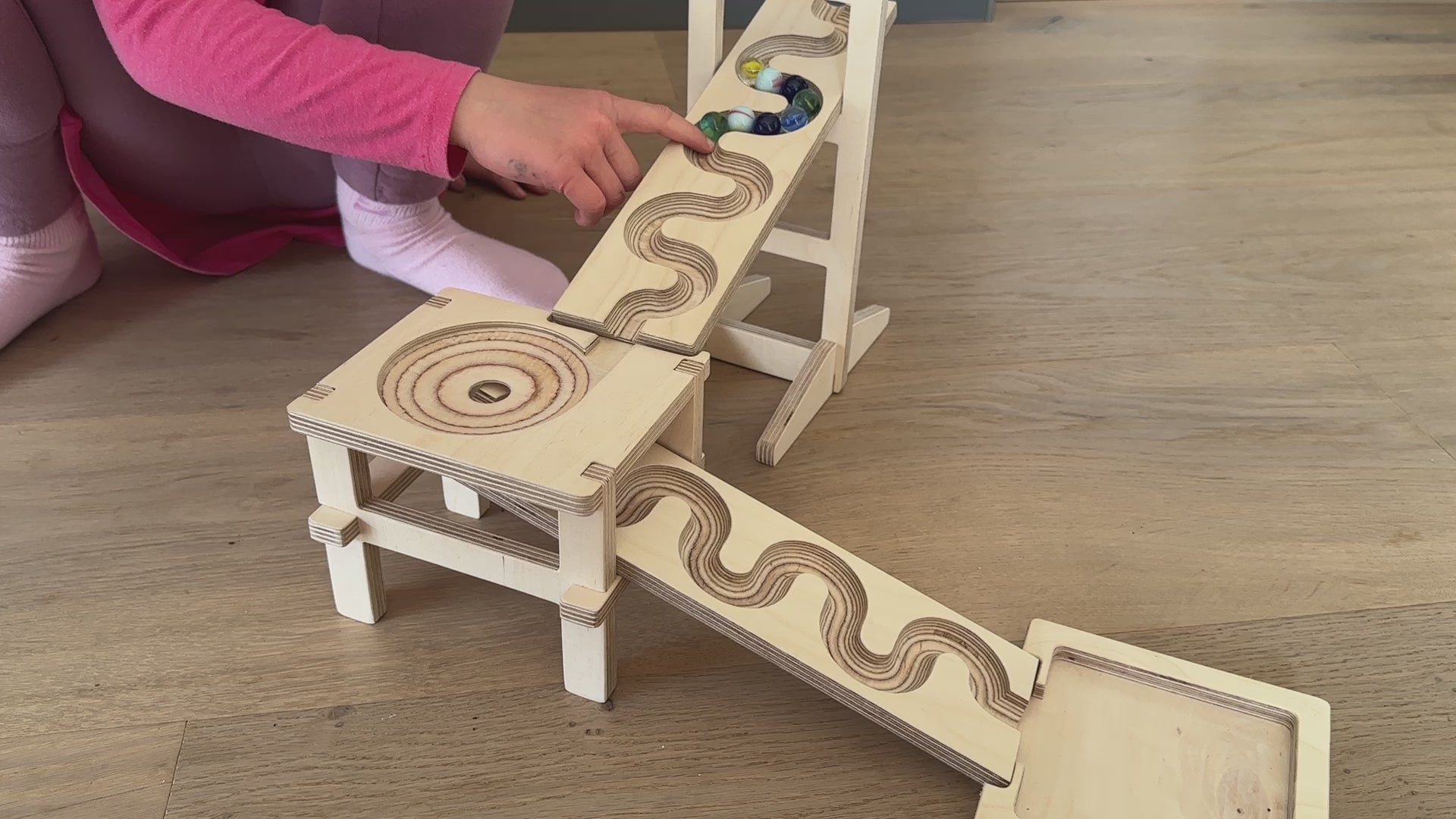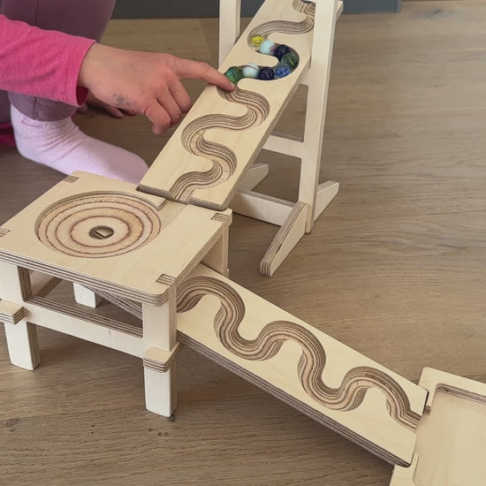 Unsere handgefertigten Murmelbahn-Set ist nicht nur ein Spaßfaktor, sondern auch eine stilvolle Ergänzung zu Ihrer Murmelbahn. Sie passen perfekt zum natürlichen Look unserer Bahnen und sind ein echter Hingucker in jedem Raum. Die Glasmurmeln sausen die verschiedenen Ebenen hinunter, bevor sie am Ende sicher in der Auffangschale landen. Ein fesselndes Spiel, das Kinder und Erwachsene gleichermaßen begeistert.